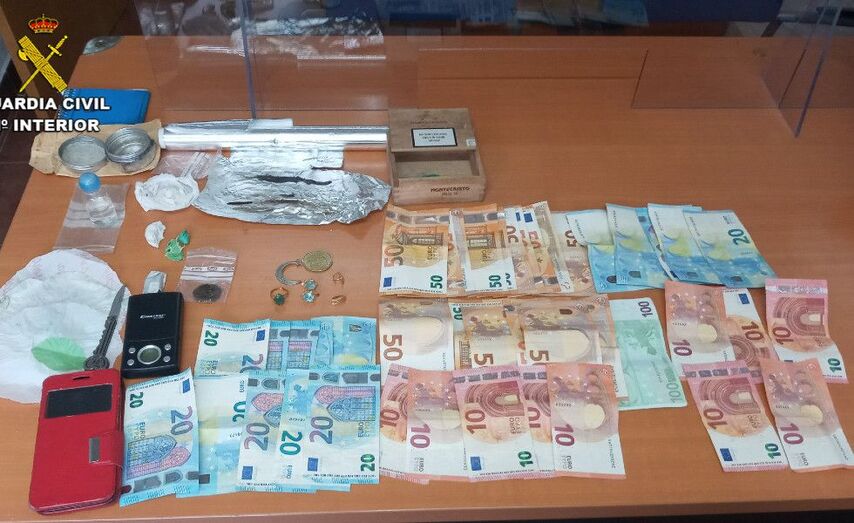 La Guardia Civil detiene a un vecino de Cangas con un surtido de drogas escondidas en el vehículo y útiles para su distribución y venta al por menor, así como dinero y joyas.