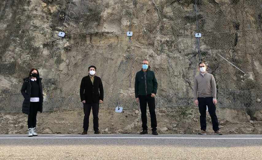 A estrada provincial EP-2102, que une Nigrán con Vincios, recuperou a normalidade tralo remate das obras de consolidación dun gran noiro que estaba a sufrir os efectos da erosión. A Deputación actuou preventivamente para evitar desprendementos e instalou unha estrutura metálica de protección cunhas obras de emerxencia valoradas nuns 31.000 euros. As obras, que concluíron hai uns días, foron visitadas hoxe polo deputado de Infraestruturas, Gregorio Agís, acompañado do alcalde, Juan González, e varios concelleiros/as.