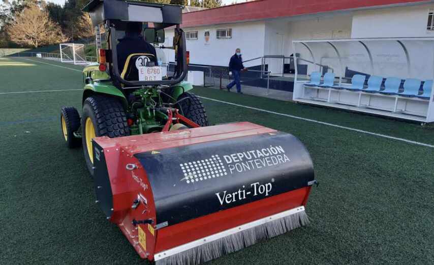 O Plan de Mantemento de Campos de Fútbol da Deputación de Pontevedra iníciase un ano máis co fin de conservar nas mellores condicións os terreos de xogo da provincia. Ata o de agora o ente provincial xa recibiu solicitudes para 71 instalacións deportivas correspondentes a 29 concellos a fin de levar a cabo os traballos de acondicionamento. Nos últimos días a Deputación xa actuou nos campos de herba sintética de Ribadelouro, no concello de Tui, e Vilaxoán, en Vilagarcía de Arousa, e fará o propio con outros 48 terreos deste tipo e 21 de herba natural. A vindeira semana continuarán os traballos en tres instalacións de Vilagarcía, concretamente nos campos municipais de Berdón, María Paz Vilas e Manuel Jiménez Abalo.