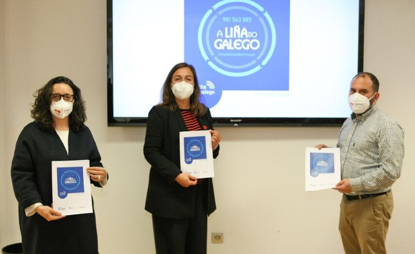 Marcos Maceira, presidente da Mesa pola Normalización Lingüística; Celia Armas, Secretaria xeral da Mesa; e María Muíño, deputada de Lingua da Deputación da Coruña, presentaronna Coruña o informe anual da Liña do Galego correspondente ao 2020. Segundo recolle dito informe, ao longo do pasado ano, a entidade de defensa da lingua tramitou 219 queixas, 20 consultas e 111 parabéns a través das chamadas, correos, e mensaxes a través da App recibidos na Liña do Galego.