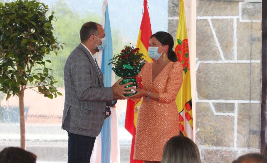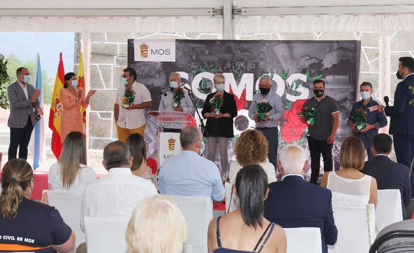 Logo do Pregón chegaron o discurso da alcaldesa, Nidia Arévalo, e a HOMENAXE Á CADEA COVID, de sectores e colectivos IMPRESCINDIBLES e AFECTADOS pola pandemia, encabezados polo conselleiro de Sanidade, Julio García Comesaña, en representación, xunto coa doutora do Centro de Saúde de Mos, Begoña Porritt, do sector sanitario.