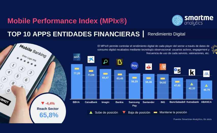 Según muestran los datos del primer trimestre del año del Mobile Performance Index (MPIx®) elaborado por Smartme Analytics, la plataforma líder en la recopilación de datos en tiempo real del comportamiento de los usuarios en el entorno digital, la aplicación de BBVA se sitúa en primera posición del ranking del Sector Finanzas, con una puntuación de 77,20. Esto supone un crecimiento de 7,14 puntos en comparación con el trimestre anterior y amplía la distancia con las tres aplicaciones principales del nuevo grupo CaixaBank, que por segundo trimestre consecutivo logran situarse dentro del Top5: CaixaBank (71,69), con una subida de 4,65 puntos; Imagin (65,47), la app con un target más joven y que experimenta una mayor subida llegando a los 8,31 puntos de crecimiento, y Bankia (63,43), con un aumento de 6,36. Les siguen en el Top10 general: Samsung Pay (56,29), Santander (55,08), ING (54,92), Banco Sabadell (47,62), Kutxabank (42,33) y ABANCA (40,79).