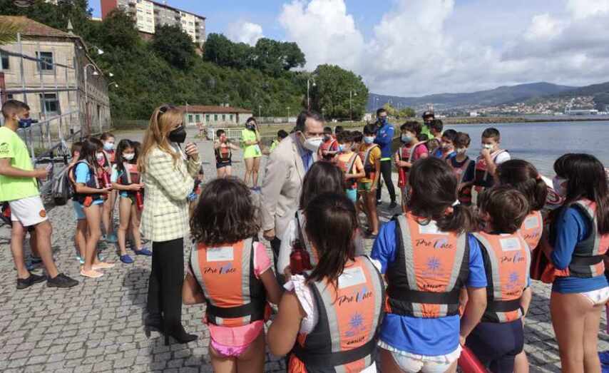 Caballero compartiu unha parte da xornada coa cativada participante na primeira sesión do campamento municipal que se desenvolve ata o venres. En total, oitenta nenas e nenos, divididos en dous grupos, asistirán á actividade que inclúe na auga a práctica de kaiak, windsurf ou pádel surf e, en terra, xogos, saídas culturais e obradoiros.