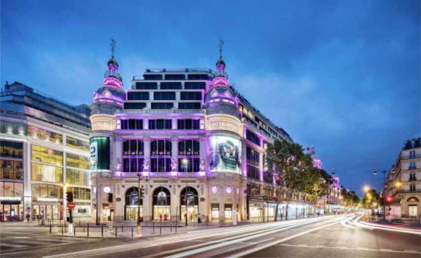 Printemps Haussmann. Reconstruido en 1882 por Paul Sédille después de un incendio, es uno de los primeros edificios públicos parisinos en afirmar su estructura metálica incluso en su fachada, siguiendo el modelo que Eiffel acababa de introducir en las construcciones. El hierro se convierte entonces en un material noble y un elemento importante de la decoración, especialmente en las vigas y escaleras. Precisamente aquí se consiguió la exclusiva de los productos derivados de la Exposición Universal de 1889, como las medallas de la Torre Eiffel, por el emprendedor fundador de Printemps, Jules Jaluzot, y que se vendían únicamente en los Grandes Almacenes.