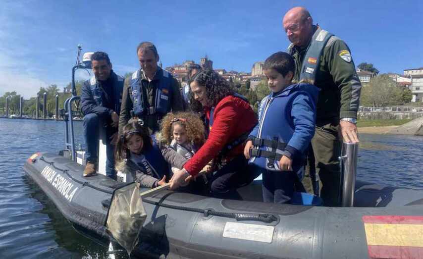 Así, na solta de esguíns de hoxe participaron unha trintena de escolares de dous colexios de Tui e de Valença do Minho, que estiveron acompañados en todo momento por persoal da Comandancia Naval de Tui —baixo o mando do comandante Pablo Redondo— e da de Caminha, que se desprazou ata o municipio pontevedrés para colaborar no dispositivo.
