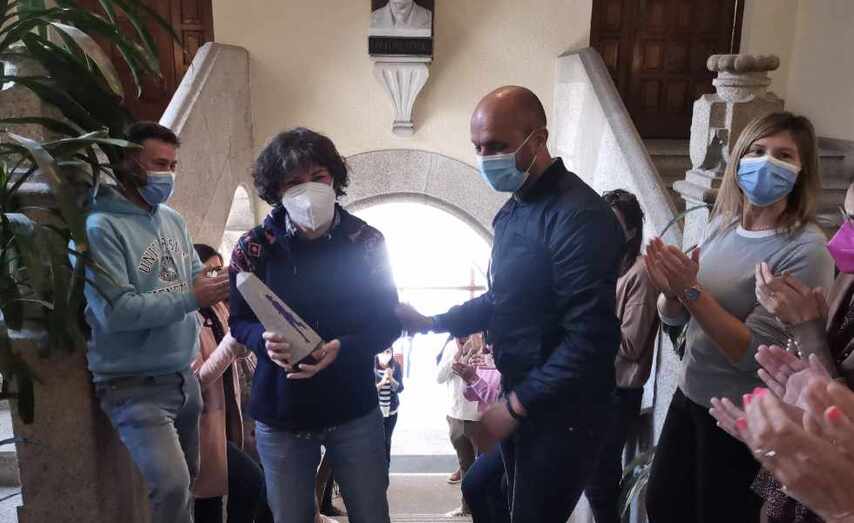 Ana Belén, funcionaria municipal, foi recibida entre aplausos no Concello e recibiu, de mans do alcalde Alejandro Lorenzo, un agasallo para recoñecer o seu logro en nome de todos os seus compañeiros e compañeiras e do seu pobo.
