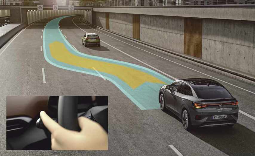 No IDE.5, Volkswagen emprega sistemas de asistencia innovadores e totalmente integrados. O «Travel Assist con datos de enxame», incluído opcionalmente, é un gran exemplo diso. De acordo cos límites do sistema, pode manter activamente o vehículo no carril e manter tanto a distancia co vehículo de diante como a velocidade máxima establecida polo condutor. Entre outras cousas, o sistema fai uso da función de guía de carril adaptativa, que mantén activamente o vehículo no centro do carril. Con todo, o «Travel Assist con datos de enxame» tamén é capaz de adaptarse ao estilo de condución e pode manter o vehículo no lado dereito ou esquerdo do carril.