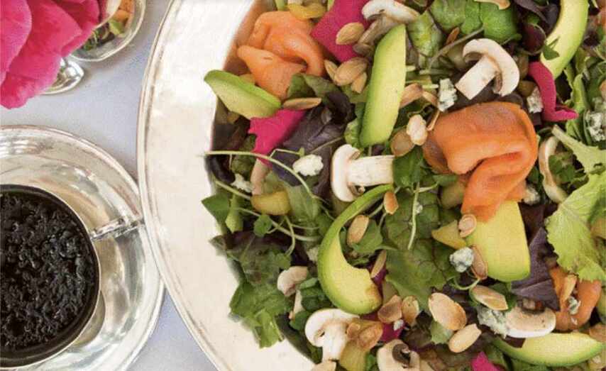 En un plato extendido colocar láminas de aguacate y salmón intercaladamente, sazonar y verter la vinagreta de guindilla.