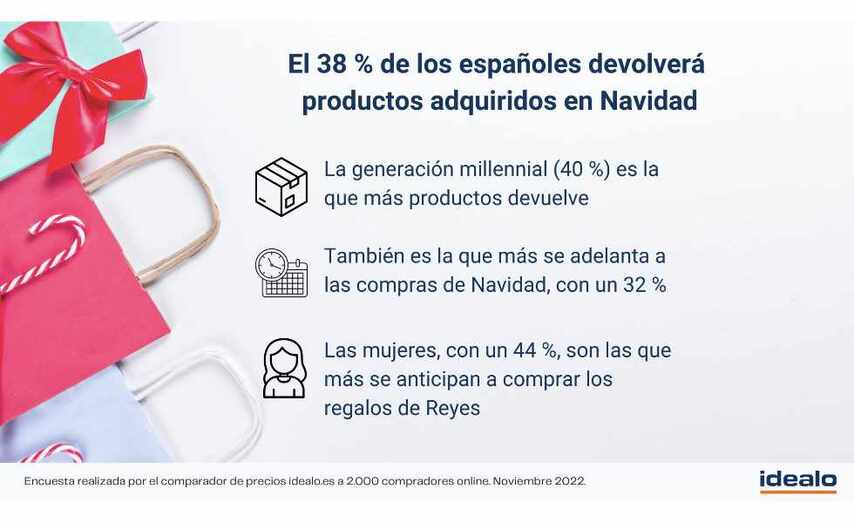 La Navidad está a la vuelta de la esquina y, como cada año, los españoles comienzan a comprar los regalos para este periodo de celebración. La actual situación económica provoca que los consumidores adelanten sus compras para aprovechar las ofertas y así conseguir los mejores precios en esta época de gastos. De acuerdo con un estudio elaborado por la consultora Accenture, los españoles prevén gastar una media de 497 euros esta Navidad, un 5 % menos que el año pasado. Al tener un presupuesto más ajustado, son muchos los que se replantean sus compras incluso después de haberlas realizado. En este contexto, el comparador de precios idealo.es ha elaborado un análisis que indica que el 38 % de los españoles prevé devolver productos adquiridos durante la época de mayor consumo del año.