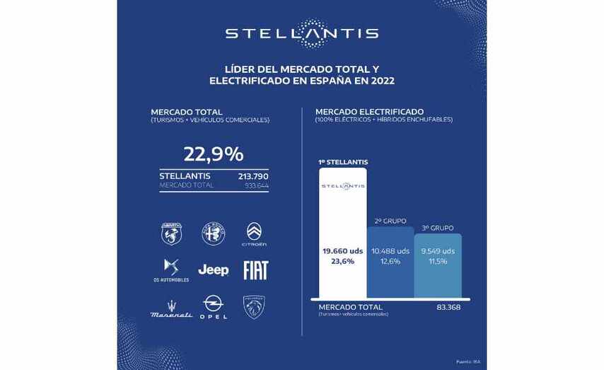 Stellantis ha cerrado 2022 como líder del mercado automovilístico total (turismos y vehículos comerciales), con 213.790 matriculaciones de sus marcas comercializadas en España (Abarth, Alfa Romeo, Citroën, DS Automobiles, Fiat, Jeep, Maserati, Opel y Peugeot), que representan una cuota de mercado del 22,9%.