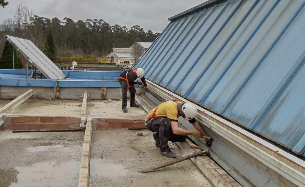 Os traballos actuáis na cuberta da zona central (onde se atopan os vestiarios) solucionan filtracións por deterioro da chapa e nas canles. Como existe unha instalación de paneis solares foi necesario retiralos para posteriormente volver colocalos, unha vez finalizados os labores. A actual chapa da cuberta será substituída por unha estrutura en aceiro galvanizado e vigetas pretensadas de formigón para a colocación dun novo panel de 30 mm de espesor. Realizaranse novas canles e baixantes para a evacuación das augas e instalarase tamén no patio existente unha cuberta translúcida.