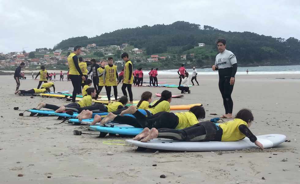 222 alumnas e alumnos participan estes días na actividade RE-COÑECÉNDONOS: Bautismo de Surf, organizada polo Concello do Porriño, a través da Concellería de Sanidade e a OMIX co obxectivo de promover entre a mocidade hábitos de vida saudable.
