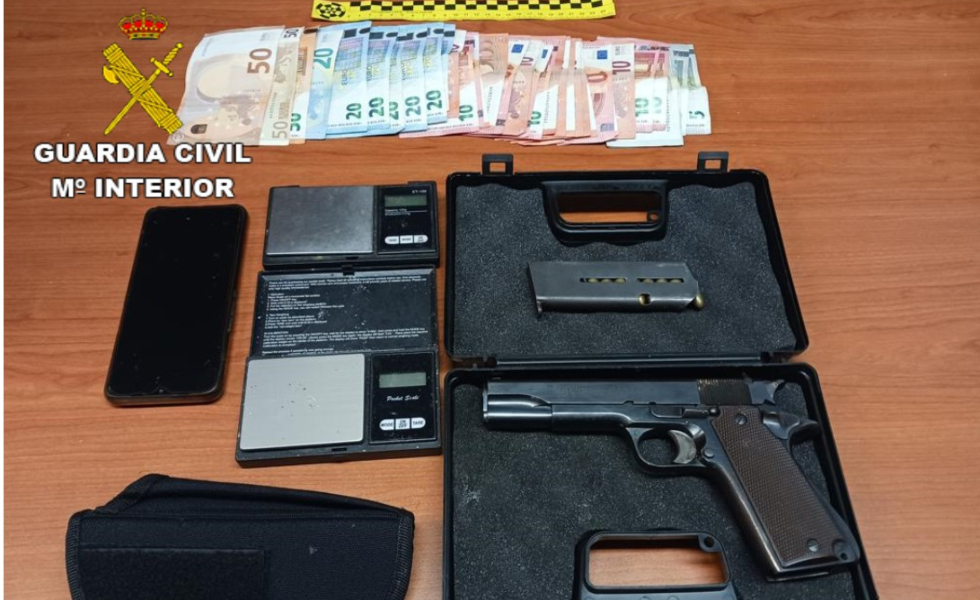 Se incautaron 19 dosis de heroína, 18 dosis de cocaína, medios para su preparación, una pistola marca Star del calibre 9mm. Largo, un teléfono móvil y 583,10 €.