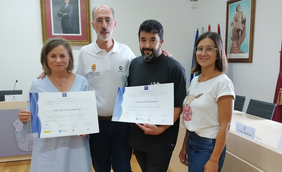 El pasado jueves 24 de agosto, en el salón de plenos del Ayuntamiento, el alcalde de Baiona, Jesús Vázquez Almuiña, y la Concejala de Turismo, Sheila González Martíns, otorgaron el distintivo del Compromiso de la Calidad Turística, Sicted, a dos empresas locales que superaron el último comité de evaluación de junio: Queimada Gastrobar y la Casa de la Navegación.