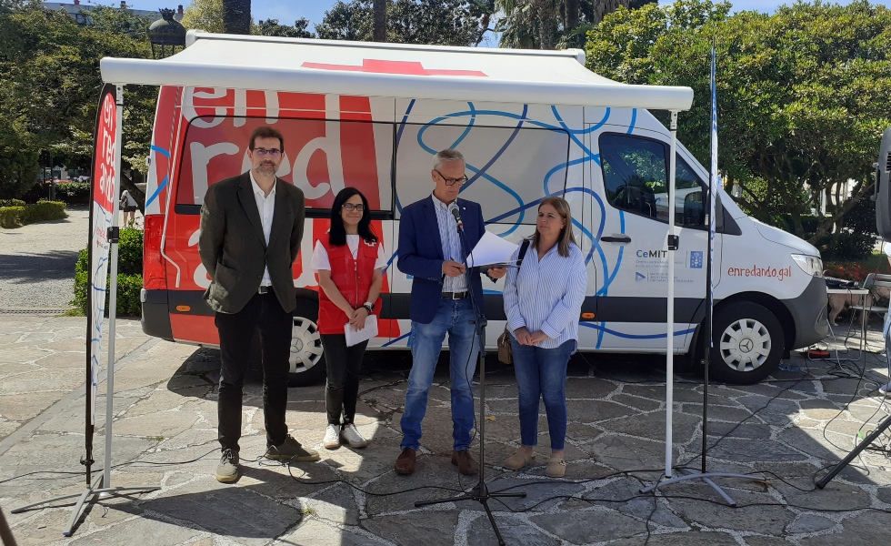 La presentación del "Enredando Tour 2024" tuvo lugar en Noia, localidad en la que se realizaron los primeros talleres de esta edición, cuyo principal objetivo es reducir la brecha digital y proporcionar herramientas para el uso de las tecnologías a personas mayores de 55 años. El vicepresidente de Cruz Roja en Galicia, Andrés Ríos, el director de la Agencia para la Modernización Tecnológica de Galicia (Amtega), Julián Cerviño, y la responsable de la Unidad de Innovación de Cruz Roja en Galicia, Trini de Lorenzo, fueron los encargados de dar a conocer los detalles y novedades de esta iniciativa.
