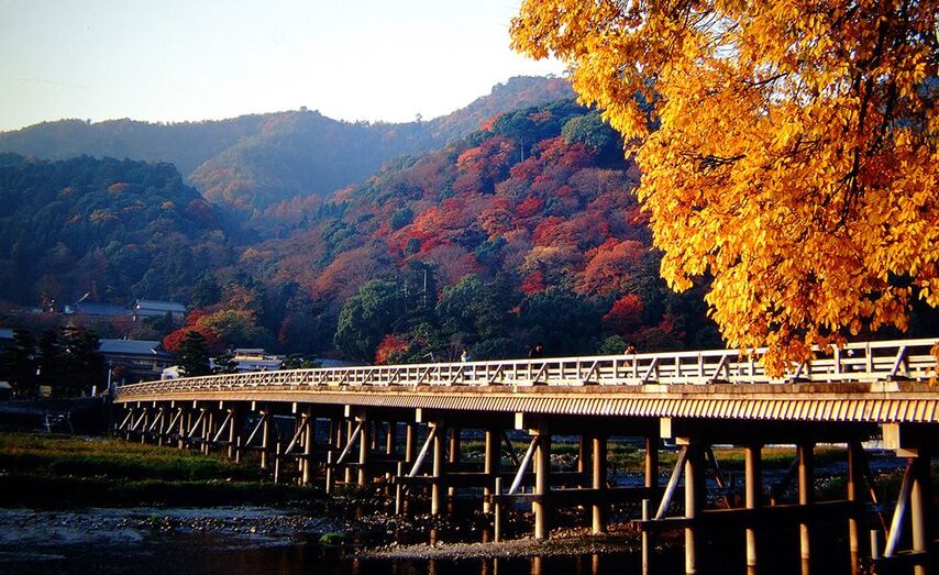 Templo de Jojakkoji. Con la llegada del otoño el templo Jojakko-ji, en Kioto, se llena de visitantes que acuden a admirar la belleza de los paisajes de la zona, denominada Arashiyama y caracterizada por estrechos caminos con encanto, pequeños templos y abundantes bosques. En esta zona destaca también el bosque de bambú de Sagano y el puente de Togetsu-kyo. El puente de madera se extiende sobre el río Katsura frente a la montaña de Arashiyama, ofreciendo unas vistas increíbles. La coloración de las hojas llega a Kioto a mediados de noviembre.