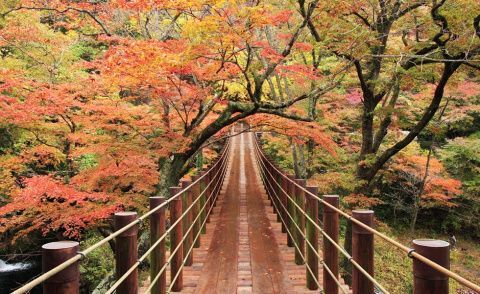 También desde la presa de Hananuki, en la prefectura de Ibaraki, hasta la zona de acampada de Namerigafuchi y Otakizawa se extienden hermosos paisajes. Para disfrutar de ello, nada mejor que realizar un paseo fluvial y pasear por el puente colgante Shiomidaki. En este puente las ramas de los árboles y sus hojas otoñales cayendo a ambos lados forman un túnel lleno de color.