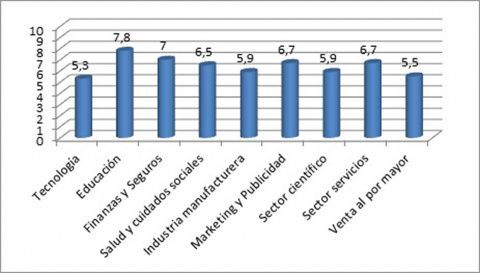 Por sectores, Educación y Finanzas son los áreas de actividad donde más índices de felicidad se alcanzan, llegando al notable: un 7,8 y un 7 sobre 10 respectivamente. En el extremo opuesto el sector tecnológico, la venta al por mayor y la industria manufacturera presentan los índices más bajos de felicidad entre sus empleados.