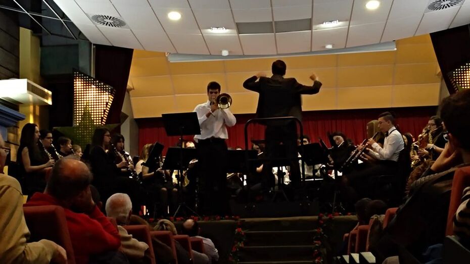 Na segunda parte do concerto, a Banda de Música Xuvenil de Xinzo ofreceu un programa de alta dificultade técnica. Destacar a magnífica interpretación do trombón solista Javier Otero, integrante da Banda de Xinzo que actualmente está a rematar os seus estudos de Grado Profesional no CMUS de Ponteareas, na obra para trombón solista e banda “Colors” de Bert Appermont.