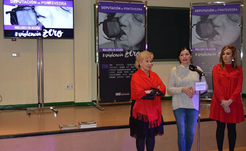 A alcaldesa de Mos, Nidia Arévalo, o concelleiro de Educación mosense, Camilo Augusto, e a deputada de Igualdade da Deputación de Pontevedra, Isaura Abelairas, acompañaron onte ao alumnado do IES de Mos no salón de actos do centro educativo durante unha acción incluída dentro da iniciativa provincial MULLERES EN ACCIÓN #ViolenciaZero. Tamén estivo presente a avogada do CIM, -Centro de Información á Muller-, do Concello de Mos, Ana María Rodríguez Cabaleiro.