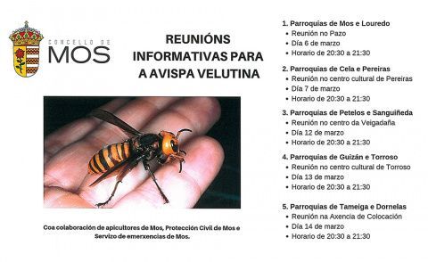 O Concello de Mos en colaboración con apicultores de Mos organiza, dentro do seu plan anual contra a Vespa Velutina, charlas nas distintas parroquias do municipio para repartir trampas e os líquidos que deben conter as mesmas, así como para explicar paso a paso a fabricación de trampas caseiras.
