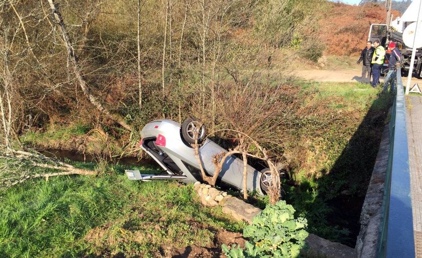 Volcado sobre el regato que atraviesa la parroquia de Torroso, así terminó un conductor que esta madrugada perdía el control de su vehículo saliéndose de la carretera en este tramo recto.