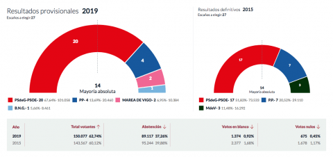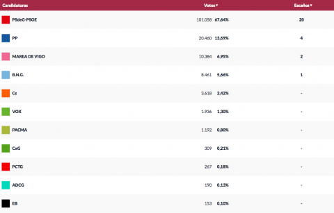 Abel Caballero seguirá gobernando Vigo durante cuatro años más al contar con una aplastante mayoría absoluta de 20 concejales y superar los 100.000 votos. Con el 100% de los votos escrutados este es el resultado provisional de las elecciones locales celebradas este domingo 26 de mayo de 2019 en el municipio de Vigo.