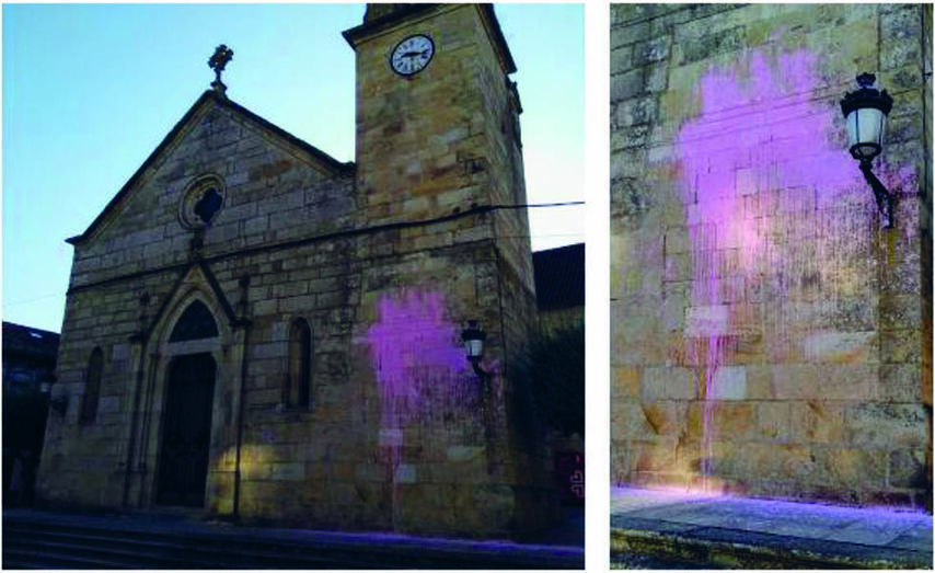 O Concello de Porriño comunicou á Dirección Xeral de Patrimonio da Xunta de Galicia e tamén á Diócese de Tui-Vigo, os danos sufridos na fachada principal da Igrexa de Santa María da Concepción que apareceu onte con pintura de cor rosa.