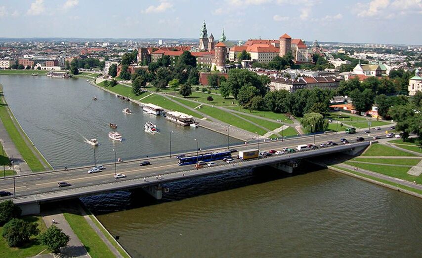 Lo ideal, antes de acometer la subida a Wawel y recorrer con detenimiento todos sus edificios, es presenciar el conjunto desde algunas de las orillas del Vístula, apreciando así su armonía. La colina de Wawel, en la que destaca la catedral con sus tres torres diferentes y el castillo, reflejándose sobre las tranquilas aguas del río, es la mejor perspectiva de Cracovia y, probablemente, una de las más espectaculares panorámicas de Europa. Es éste además un lugar muy popular. En las apacibles praderas que bordean el Vístula pasean las parejas, juegan los niños o se organizan pequeños pic-nics. Unas mesas de madera suelen ser lugar de cita de ancianos y también jóvenes que disputan interminables partidas de ajedrez. Un camino asfaltado, en fin, suele congregar a los ciclistas y patinadores.