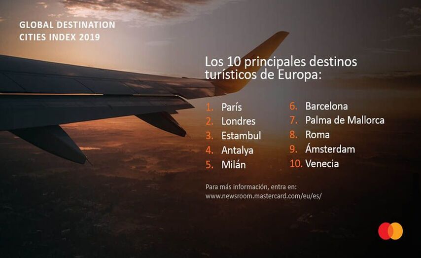En Europa, París se alza como el principal destino, seguida por Londres, que pierde así el primer puesto. Por su parte, Barcelona y Palma de Mallorca entran en el top 10 (puestos 6 y 7 respectivamente). De cara a 2019, el Global Destinantion Cities Index 2018 de Mastercard prevé que Barcelona experimentará un aumento del 4,78% en el número de turistas internacionales, mientras que Palma de Mallorca tendrá un incremento del 4,40%. Por su parte, las ciudades europeas que más crecerán en número de turistas serán Estambul y Antalya, con un 8,14% cada una.