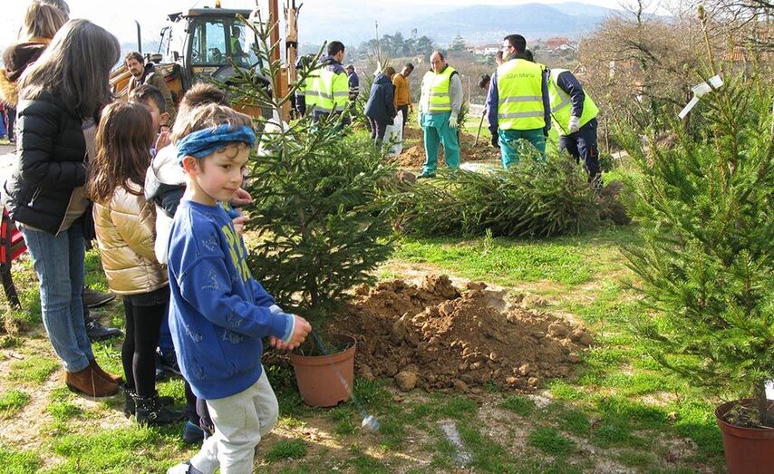 Os exemplares foron plantados esta semana polos nenos no parque público de Poutón (Vilariño) grazas á colaboración das concesionaria Brocoli, Cespa e Aqualia e aos viveiros Figueragro e Casaplanta