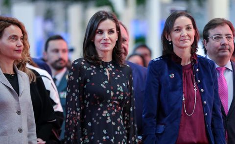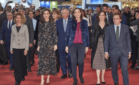 LETIZIA. Este año la reina Letizia inauguró FITUR en solitario ya que el rey se encontraba de viaje en Israel. Hizo un recorrido maratoniano por diversas empresas y destinos españoles: Hotusa, Paradores, Meliá, Iberia, Renfe, Enaire, Adif, Puertos del Estado, Aena, Turespaña, Comunidad de Madrid, Galicia, Navarra, Andalucía y, naturalmente, Asturias, donde se entretuvo un buen rato con su presidente Javier Fernández y la consejera de Cultura, Política Lingüística y Turismo, Berta Piñán. En el recorrido internacional, visitó los stands de Senegal, Marruecos, México y Corea, país socio de Fitur 2020. Precisamente para este acto, y tal vez como un guiño al país asiático, Letizia vistió un outfit que ya lució el pasado otoño durante un viaje a Corea. El vestido es negro de estilo camisero con estampado confeti, con un diseño midi, cuello redondo con mini abertura en el escote, manga terminada en puño abotonado, corte evasé y bajo asimétrico. La prenda pertenece a la firma Massimo Dutti y destaca por su elegancia. En su momento el vestido costaba 99,95 euros y se agotó después del gran éxito que tuvo. Para completar el outfit la reina escogió unos zapatos de salón de tacón alto.
