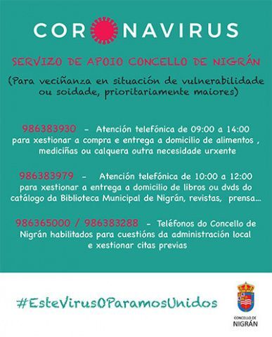 "Ante esta situación de alarma e emerxencia desde o goberno de Nigrán queremos transmitir á veciñanza máis vulnerable que non está soa, que estamos aquí para acompañar e axudar a levar mellor estes días de confinamento necesario, non somos alleos ás complicacións engadidas que supón este estado de alarma para moita xente", subliña o alcalde, Juan González. Así, o Concello facilita xa a liña telefónica oficial 986383930 (operativa de 9:00 a 14:00 horas) co obxectivo de xestionar a compra e entrega a domicilio de menciñas e alimentos. Para requirir o préstamo a domicilio dalgunha publicación do catálogo da Biblioteca Municipal ou revistas, prensa... o teléfono de contacto é o da propia Biblioteca (986383979) de 10:00 a 12:00 horas (igualmente, o Concello anula ata novo aviso o prazo de devolución de préstamo de libros para aquelas persoas que actualmente teñen algún). En ambos casos (alimentos ou publicacións) o reparto a domicilio é para persoas en especial risco ante o Covid-19, ou en soidade ou sen medios.