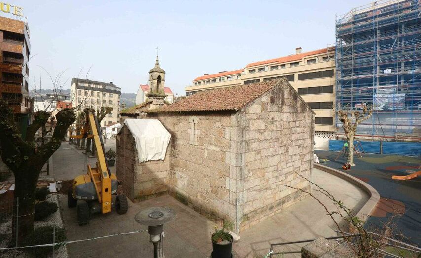 A empresa de construcción á que pertenecía o guindastre que bateu o martes contra a capela do Cristo e o edificio de Telefónica, comezou a instalar toldos para evitar que a chegada de choivas anunciadas para vindeiros días agraven os danos neses inmobles.