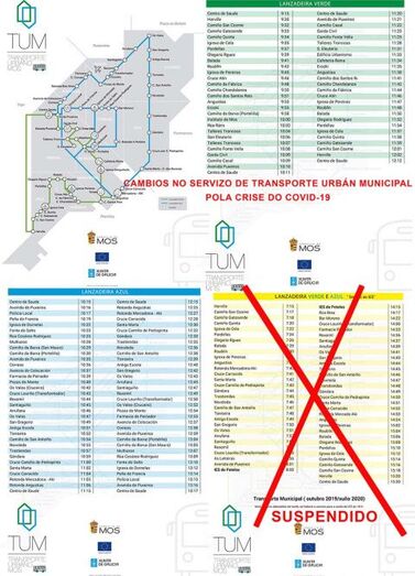 O Concello de Mos, dentro das medidas preventivas pola crise do COVID-19, reduce os servizos do Transporte Urbán Municipal, anulando a ruta fusionada das lanzadeiras azul e verde (ruta amarela) ao diminuír os viaxeiros que se dirixen ao Centro de Saúde e ao Instituto.