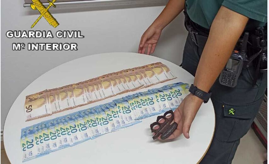 Al examinar el contenido del envoltorio que había escondido, la Guardia Civil comprobó que se trataba de un fajo de billetes de 20 y 50 euros, sujetados por una goma elástica, y una llave de pugilato (puño americano), considerada como un arma prohibida, incautándosele un total de 68 billetes falsos, 44 de 20 euros y 24 de 50.