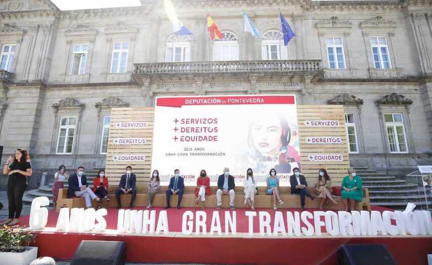 ”Seis anos dunha gran transformación da provincia con máis servizos, máis equidade e máis dereitos”. Baixo estes parámetros o goberno de Carmela Silva fixo balance este venres, no ecuador do segundo mandato, dos seis anos ao fronte da Deputación de Pontevedra. Nun acto celebrado na explanada de Montero Ríos fronte ao Pazo Provincial, ao que asistiron alcaldes e alcaldesas dos concellos da provincia, amais de colectivos e representacións de diferentes sectores, a presidenta e o vicepresidente da institución renderon contas dos seis anos transcorridos no goberno, dos que puxeron en valor “o cambio na acción política” a través da “equidade” na dotación de recursos aos concellos, “somos a administración provincial de todo o estado que máis transferencias fai aos municipios”, e a vontade de sumar sinerxías para construír o presente e o futuro dunha provincia sostible desde os eixos da igualdade, a mobilidade, a dixitalización e o compromiso co medio ambiente.