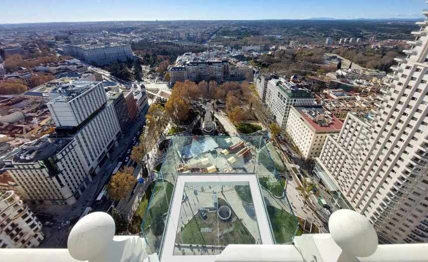 La terraza 360 del hotel RIU de Madrid ha añadido un atractivo más a sus espectaculares vistas de la capital: un mirador transparente sobre la recién inaugurada Plaza de España. Este balcón de vidrio, solo apto para valientes, está suspendido a 100 metros de altura y ofrece una panorámica del sur de la capital, con unas perspectivas únicas de la Casa de Campo, el Palacio Real o el Templo de Debod.