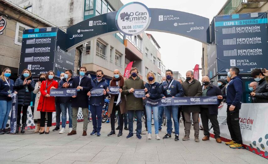 O secretario xeral para o Deporte, José Ramón Lete Lasa, acompañado dos delegados territoriais da Xunta en Vigo, Marta Fernández-Tapias, e Pontevedra, Luis López, o Alcalde do porriño e outras autoridades, participou no corte de cinta da primeira etapa da Volta Ciclista a Galicia O Gran Camiño entre O Porriño e Vigo.