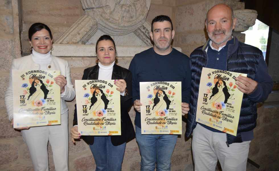 A alcaldesa de Mos, Nidia Arévalo, o seu tenente de alcaldesa, Camilo Grandal, o concelleiro de Igualdade mosense, Leo Costas, e a Xurídica do CIM de Mos, Ana María Rodríguez Cabaleiro, veñen de presentar as III Xornadas da Muller de Mos que se celebrarán os próximos días 17 e 18 de abril no Pazo de Mos en horario de 16.30 a 20 horas e baixo o título CONCILIACIÓN FAMILIAR: REALIDADE OU UTOPÍA.