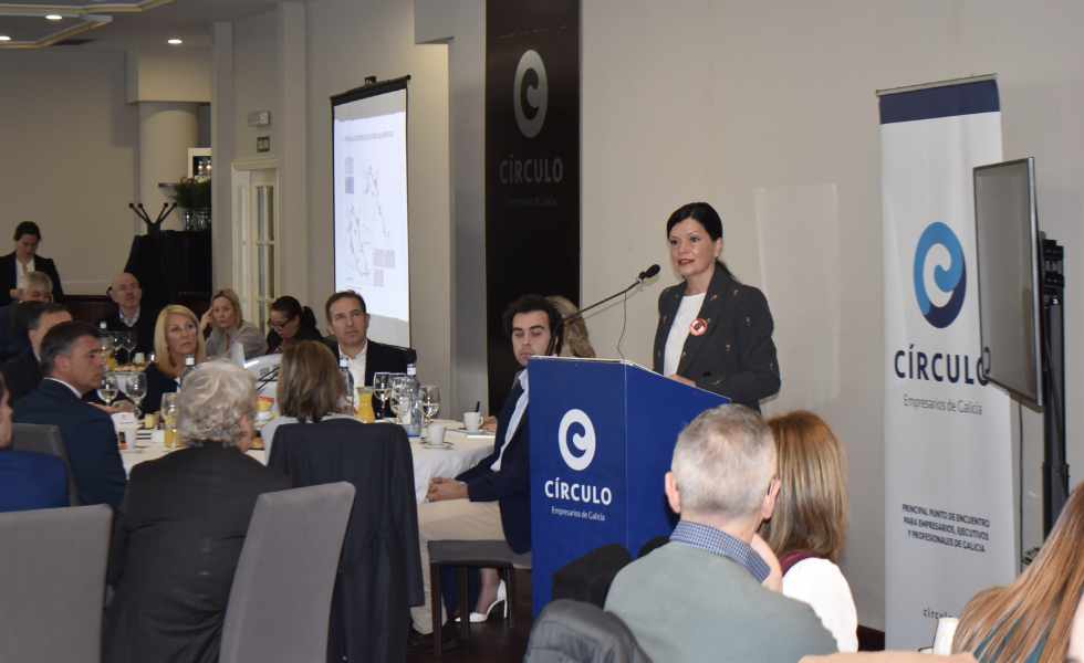 La alcaldesa de Mos y senadora por Pontevedra, Nidia Arévalo, presentó hoy en un desayuno-coloquio en el Círculo de Empresarios de Galicia los impactos negativos que la nueva autovía A-52 tendrá sobre el tejido empresarial de la Área Metropolitana de Vigo. Arévalo estuvo acompañada por el presidente de AEMOS, Manuel Castro, y fue presentada por la presidenta del Círculo, María Borrás.