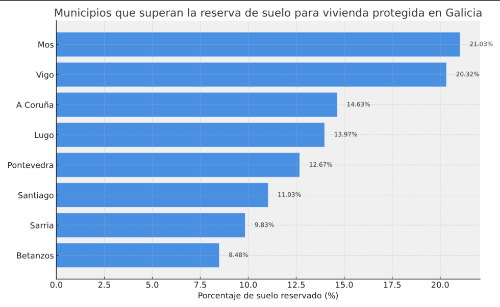 La normativa afecta a los municipios de más de 5.000 habitantes que calculan sus reservas en función de la demanda real registrada en el Rexistro de Demandantes de Vivenda. De los ocho concellos que superan el porcentaje medio gallego, Mos ocupa el primer lugar, seguido de Vigo (20,32%) y A Coruña (14,63%).