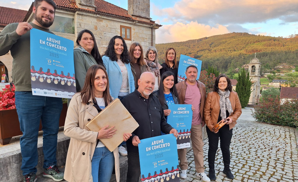 La alcaldesa Nidia Arévalo, junto a la concejala de Cultura, Sara Cebreiro, y miembros del grupo Arume, presentaron hoy la programación que culminará el sábado 24 de mayo, a las 12:00 horas, con una actividad familiar en el Pazo de Mos titulada Un corazón á intemperie, dedicada a la figura de Castelao.