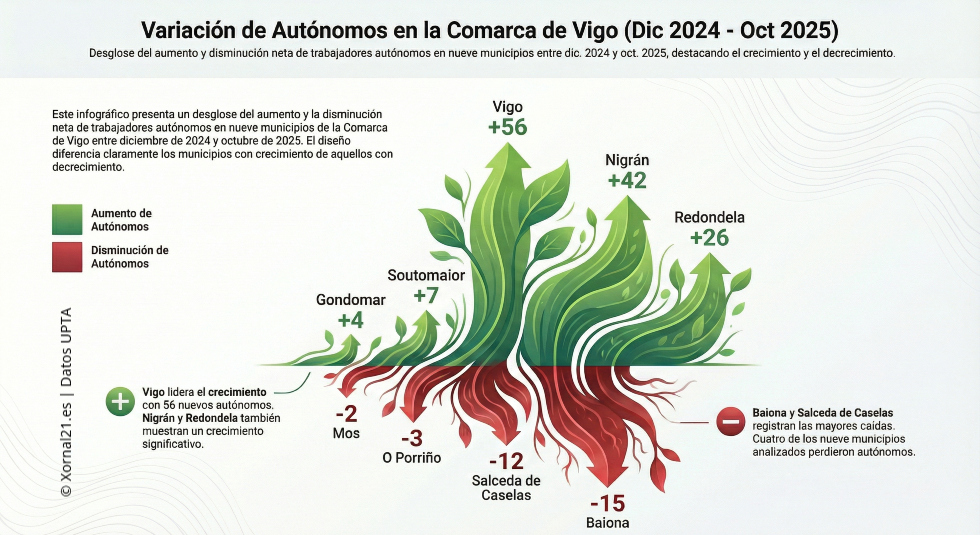 La evolución del trabajo autónomo en la Comarca de Vigo presenta realidades divergentes, y O Porriño se sitúa entre los municipios que no logran capturar el crecimiento moderado del conjunto. Según el último informe de la Unión de Profesionales y Trabajadores Autónomos (UPTA) para diciembre de 2025, el concello perdió 3 autónomos entre diciembre de 2024 y octubre de 2025, pasando de 1.366 a 1.363 afiliados al Régimen Especial de Trabajadores Autónomos (RETA). Esta cifra lo coloca en el reducido grupo de localidades con balance negativo, junto a Mos, Baiona y Salceda de Caselas.